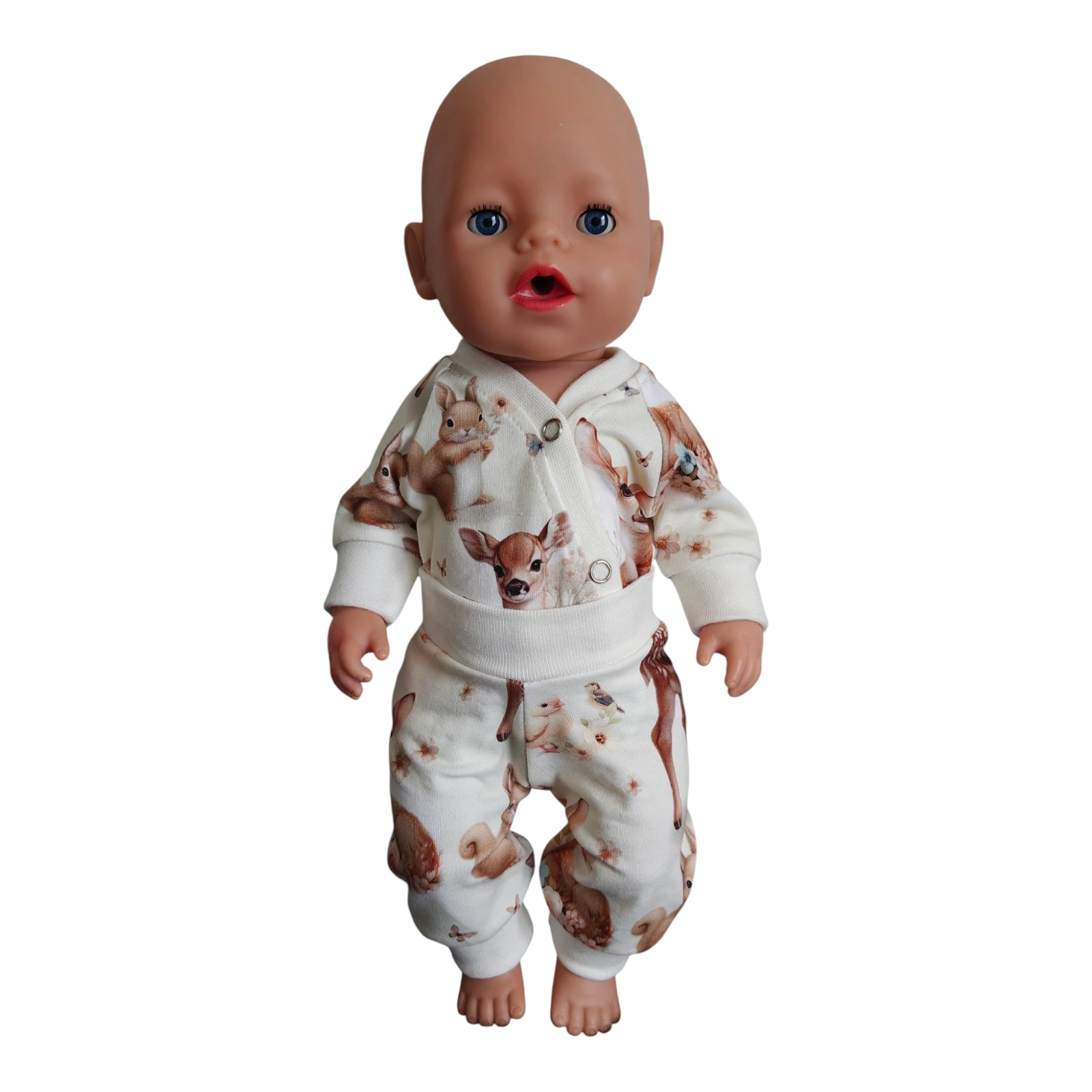 Lapsesõbraliku disainiga bodi ja püksid. Lapsel lihtne bodi ja pükse nukule selga panna ja ära võtta, bodi kinnitatakse trukkidega.